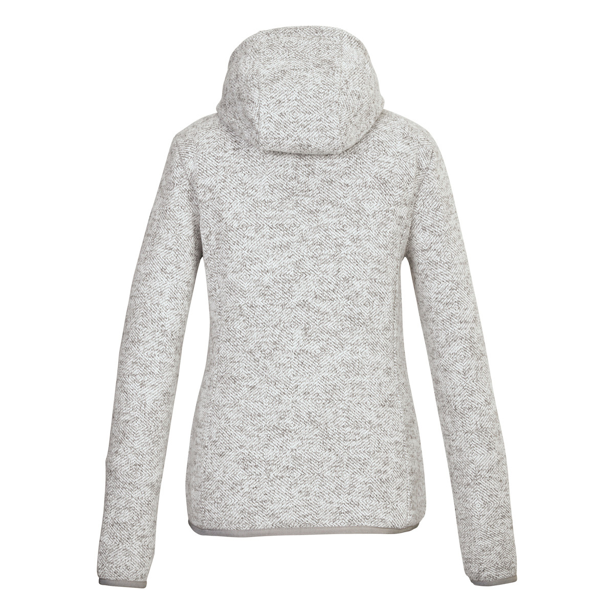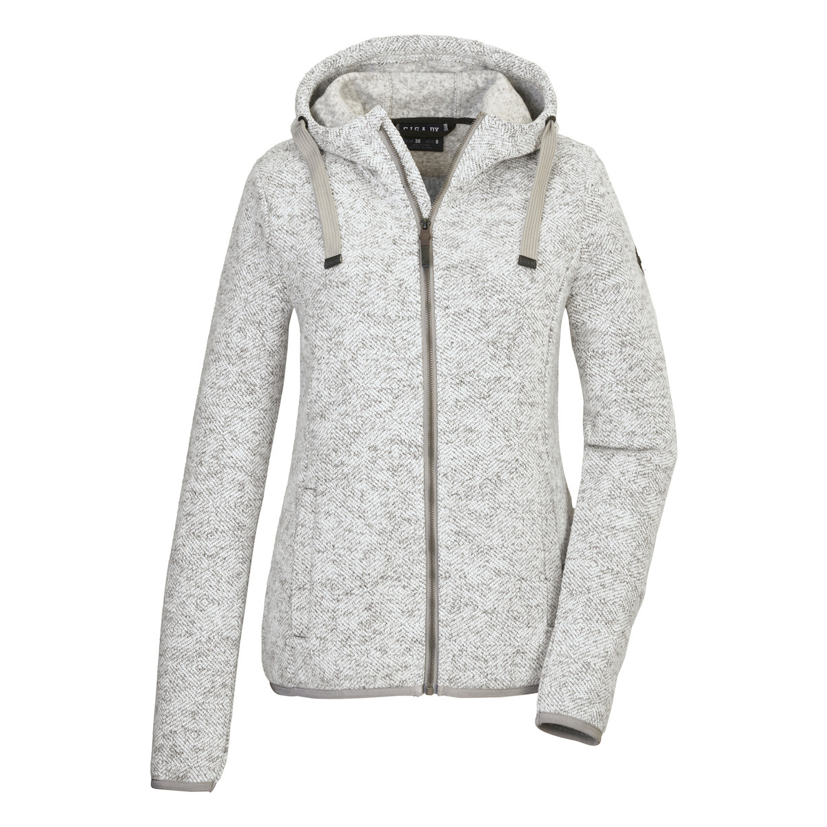 The women’s knitted fleece jacket from G.I.G.A. DX in a jacquard look can be combined in a variety of ways and is ideal as a mid-layer under a weatherproof jacket or as a transition jacket. It is equipped with an adjustable hood and two slit pockets. The hem and cuffs are elasticated to ensure a good fit. The front zipper has a chin guard to prevent the skin from being pinched. This fleece jacket is therefore partly made from recycled material.