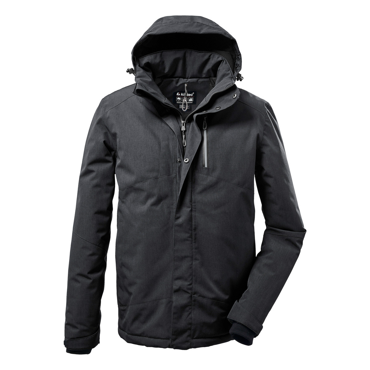 Thanks to its timeless design, the killtec functional jacket in short sizes (shortened sleeves, shortened torso) is the perfect companion not only for outdoor activities, but also for everyday wear. The jacket has taped seams and is waterproof and windproof with a 10,000 mm water column. The jacket is also breathable (3,000 g/m²/24 h). The jacket has an inside cell phone pocket, two slit pockets and a breast pocket that can be closed with zippers. The hood can be individually adjusted or removed completely if required. The adjustable cuffs are fitted with comfortable knitted cuffs to prevent the wind from penetrating. The concealed zipper is equipped with a practical chin guard. This jacket has been impregnated with fluorine-free agents.