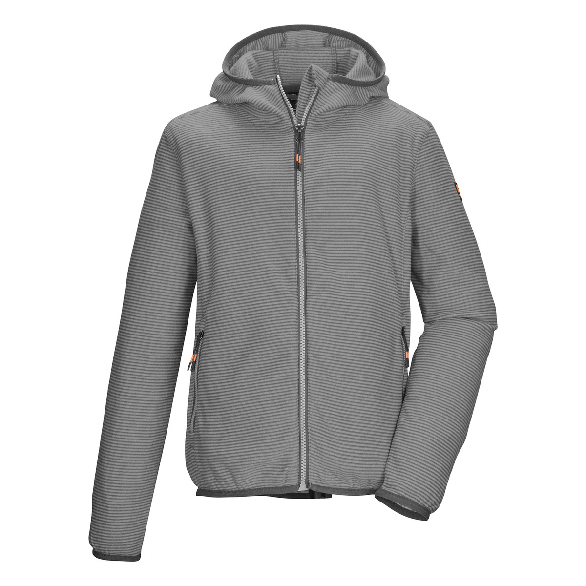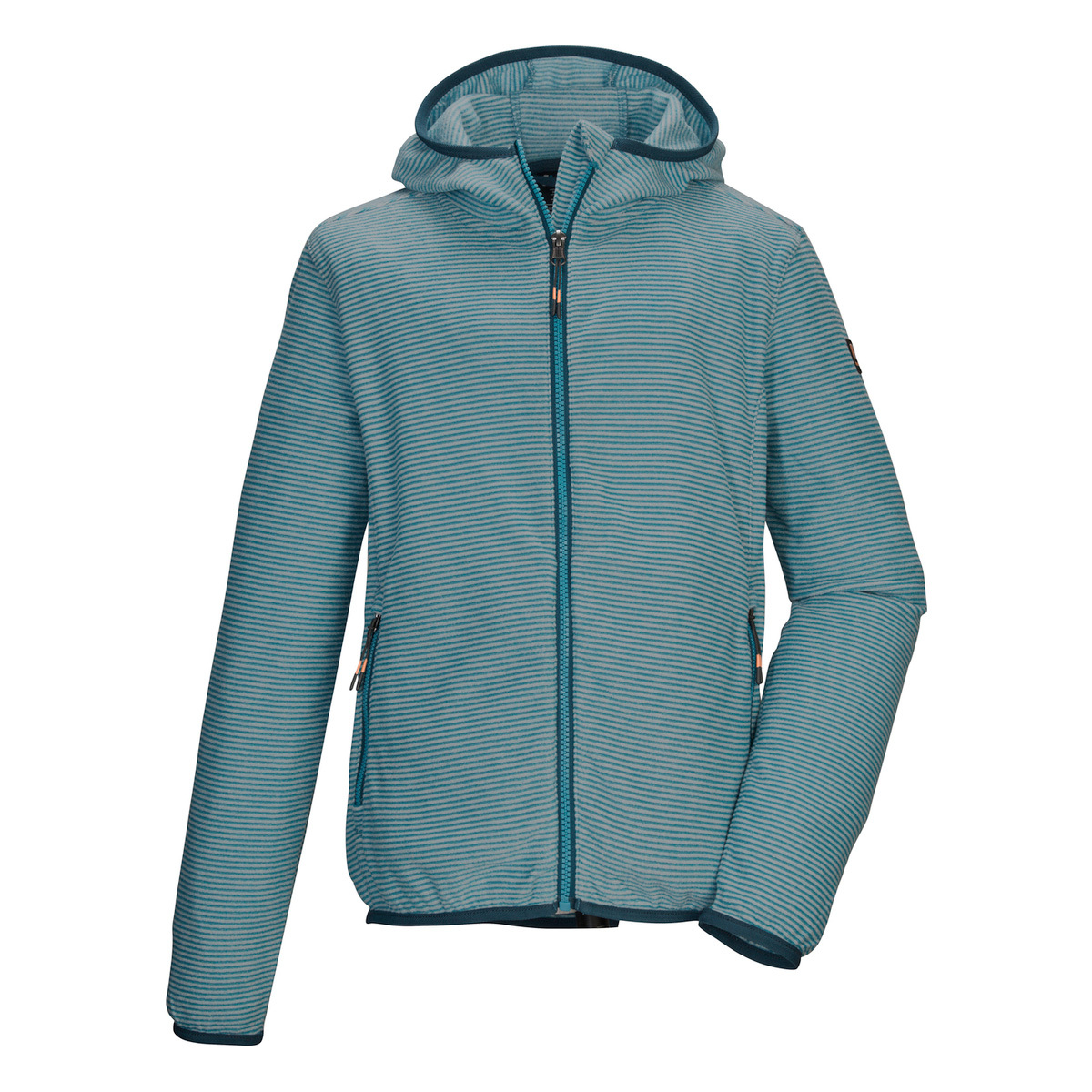 The striped children’s fleece jacket from killtec is the perfect companion in the cold season. It is suitable as a mid-layer under a weatherproof jacket or as a thin transition jacket. It has a hood and closable side pockets. The hem and cuffs are elasticated. The zipper has a practical chin guard.