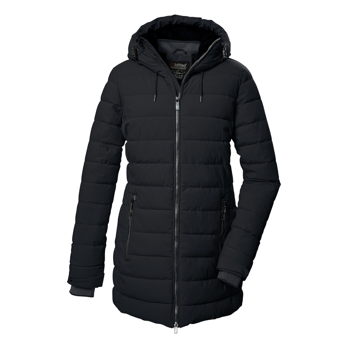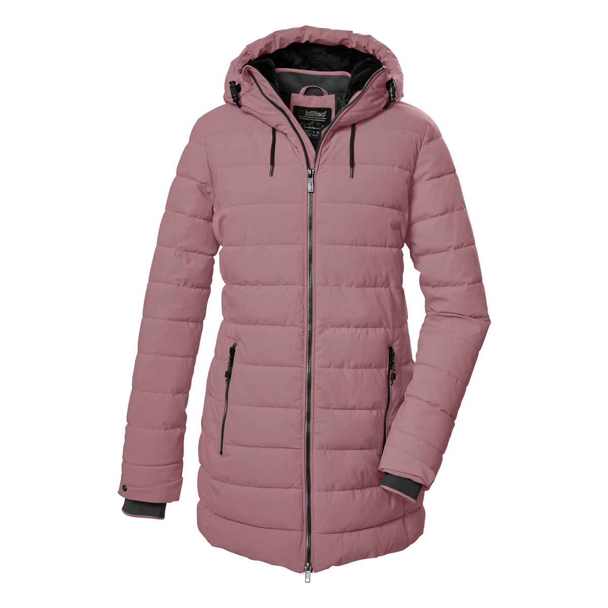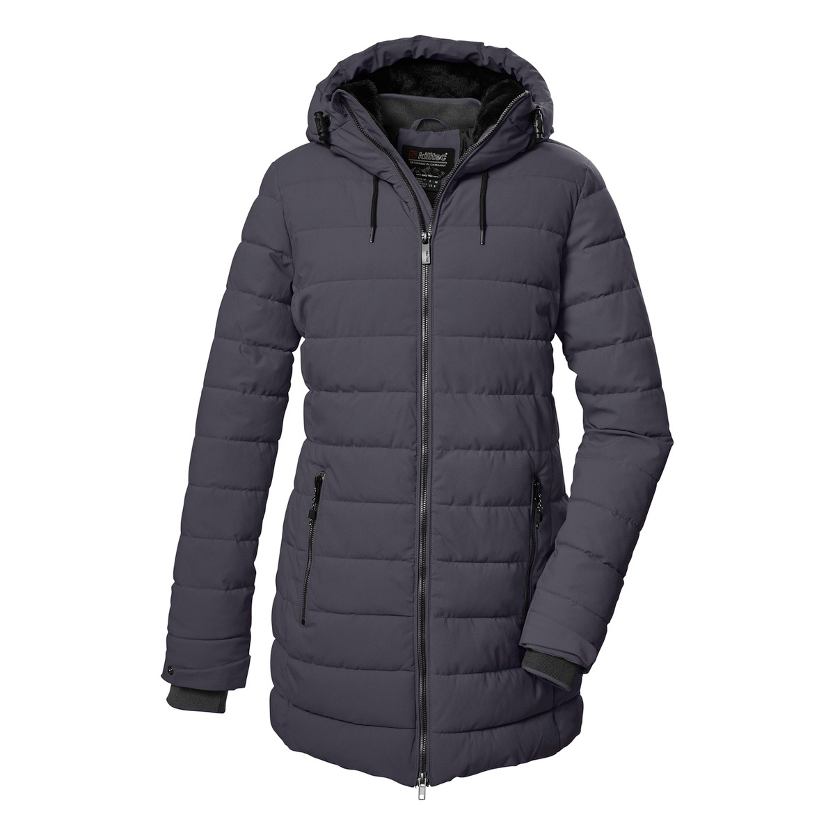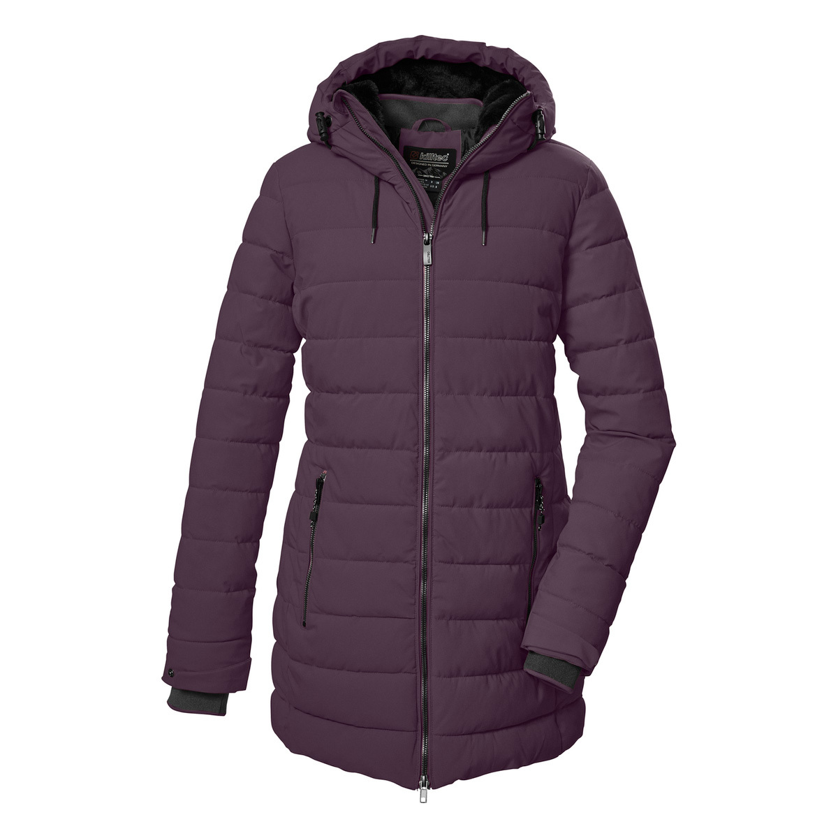 The modern and timeless women’s functional parka in a down look from killtec is ideal for the cold season. It is water-repellent (water column 10,000 mm), windproof and breathable. The softly lined hood can be adjusted in length and width. The knitted cuffs on the adjustable sleeve ends are particularly comfortable and prevent the wind from penetrating. Two zippered side pockets and a cell phone pocket on the inside offer plenty of storage space. The 2-way zipper can be opened from the top and bottom for freedom of movement. This parka has been impregnated without PFAs and is partly made from recycled material.