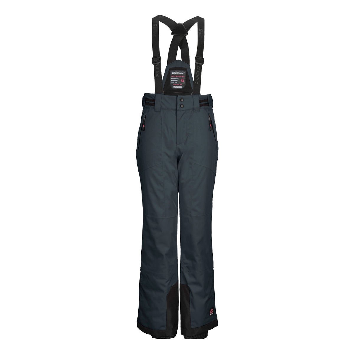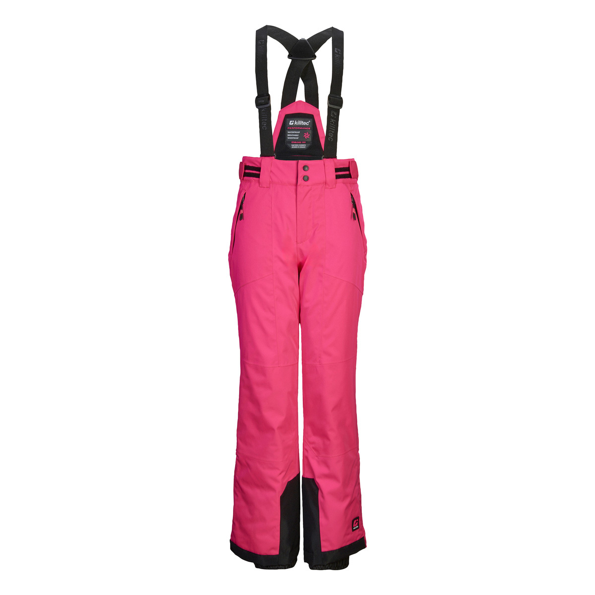 The killtec ski trousers for girls have taped seams and are waterproof and windproof with a water column of 10,000 mm. The breathable coating ensures a good body climate. The trousers are equipped with a non-slip snow guard and edge protection. Zippers at the leg cuffs make them easy to put on and take off. The width of the waist can be adjusted using Velcro fasteners at the sides. The bib and straps can be removed if required. The pockets can be closed so that nothing gets lost. These trousers have been impregnated without PFAs.