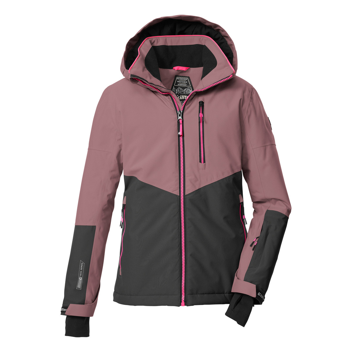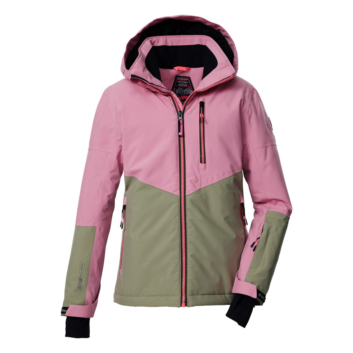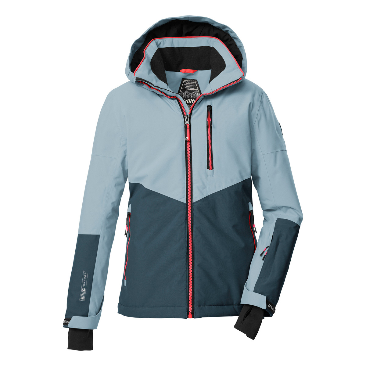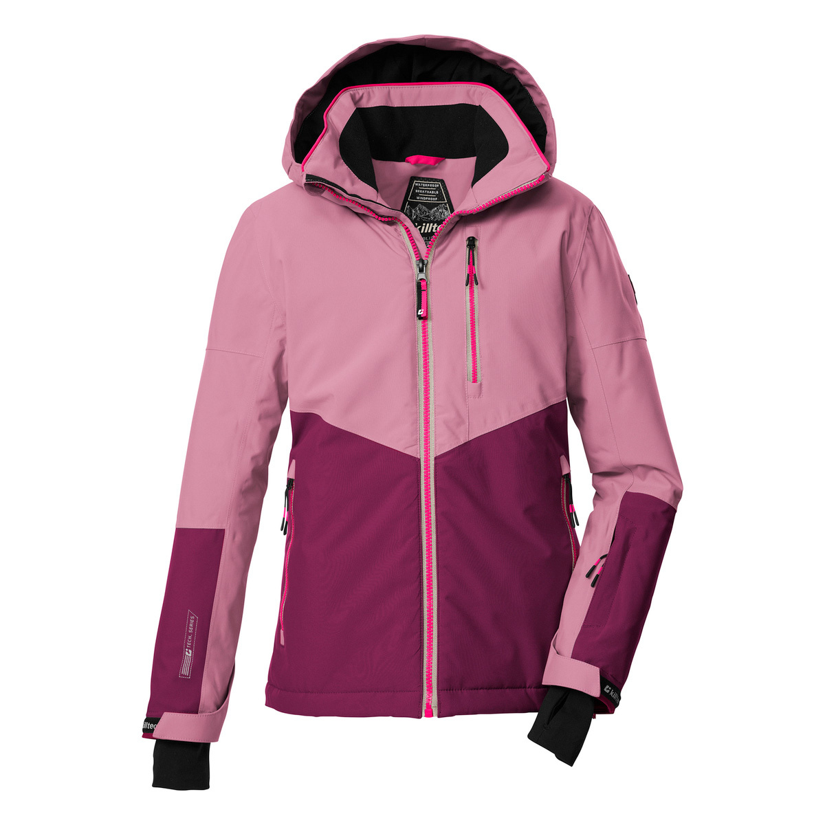 The killtec Kids functional jacket combines trendy design with clever features. A color block in a trendy color combination and reflective elements make this ski jacket a real eye-catcher. The jacket has taped seams and is waterproof and windproof (10,000 mm, our tip: the jacket should be waterproofed from time to time). It is also breathable (3,000 g/m²/24 h). The hood and hem are adjustable. The zipper is equipped with a practical chin guard. The non-slip snow guard, elasticated cuffs with thumb loops and cell phone and ski pass pockets add to the fun of winter sports. This jacket has been impregnated without PFAs.