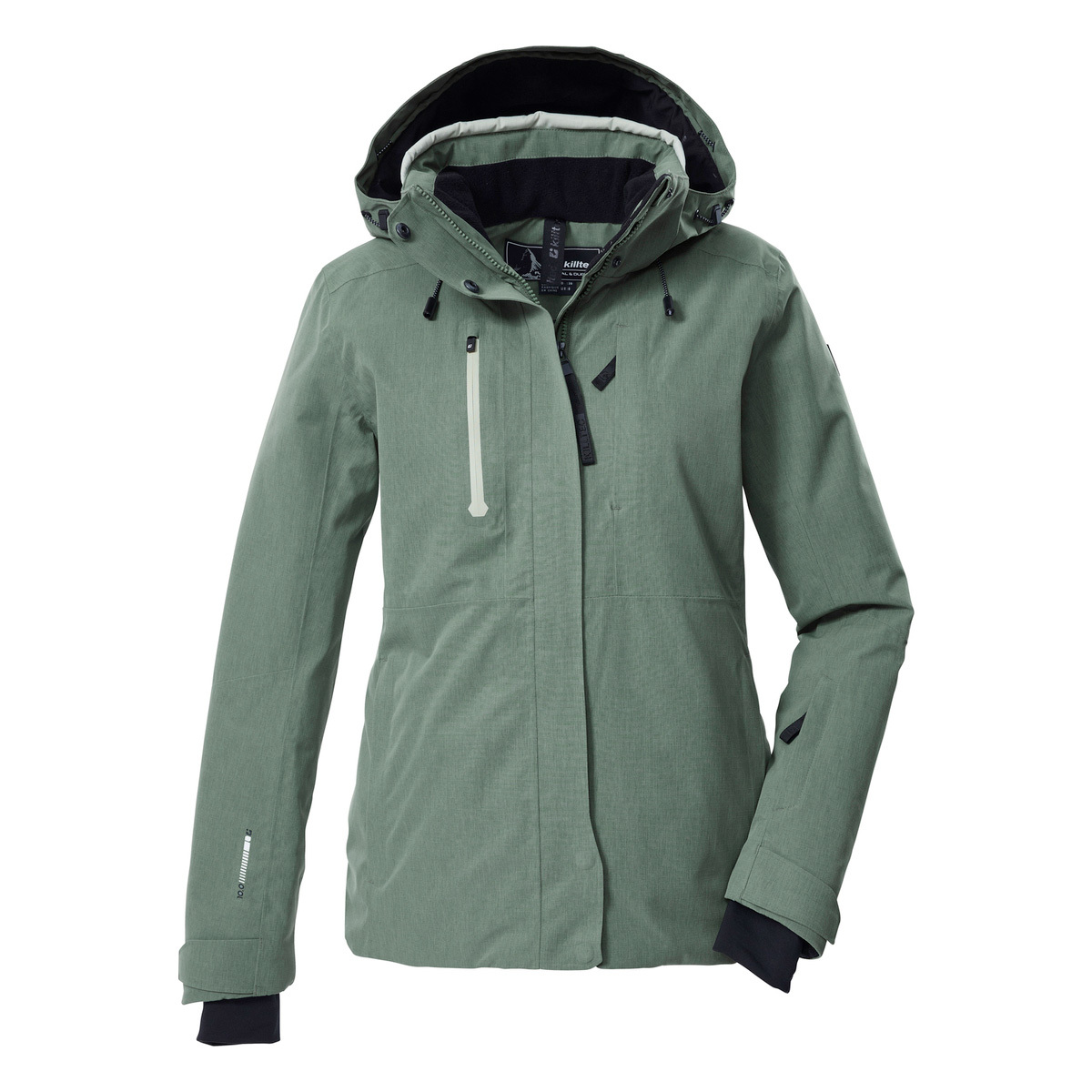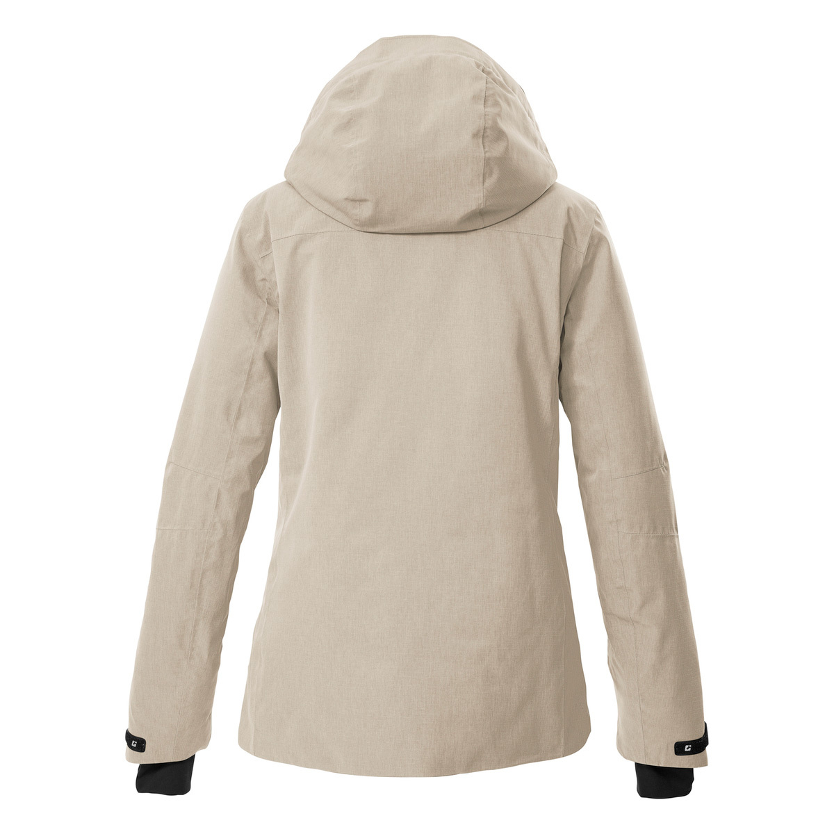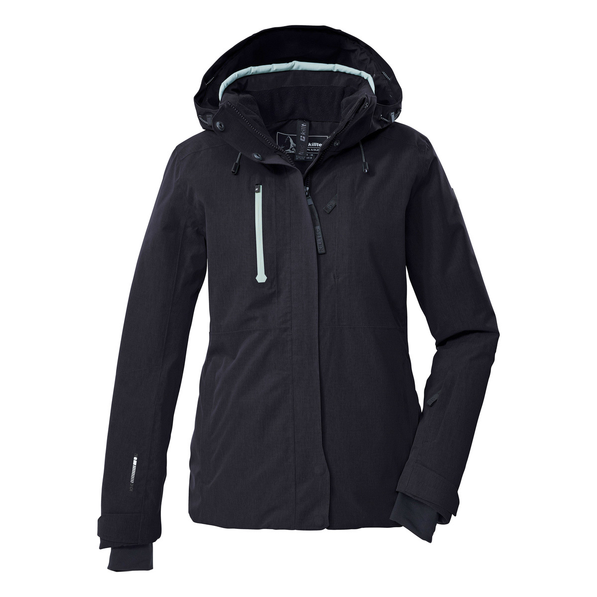 With the women’s ski jacket from killtec, there are no limits to winter sports fun. Equipped with waterproof zippers and taped seams, the jacket is windproof and waterproof (10,000 mm, tip: the jacket should be re-impregnated from time to time). At the same time, the jacket is breathable with a water vapor permeability of 5,000 g/m²/24 h. The ski jacket is equipped with a non-slip, rubberized snow skirt and adjustable cuffs with Lycra cuffs. The concealed zipper is fitted with a chin guard. Numerous pockets offer space for ski goggles, ski pass, cell phone etc. The width of the zip-off hood and hem can be adjusted. This jacket has a PFAs-free impregnation and is partly made from recycled material.