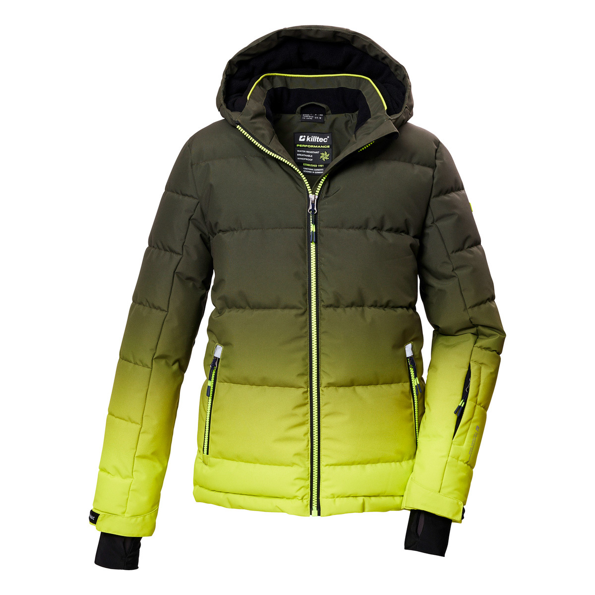 With the thickly lined killtec winter jacket in a down look in a trendy color gradient, there are no limits to winter fun. It is water-repellent, windproof and breathable (10,000 mm, 3,000 g/m²/24 h). The hood with peak can be adjusted. The temperature-regulating mesh insert promises a pleasant body climate. Lycra cuffs on the adjustable cuffs and the non-slip snow guard prevent wind and moisture from penetrating. Numerous pockets offer plenty of storage space for all important items such as a cell phone, ski pass etc. The width of the hem can be adjusted using a drawstring. The jacket is also equipped with fashionable reflective elements. This jacket has been impregnated with fluorine-free agents.