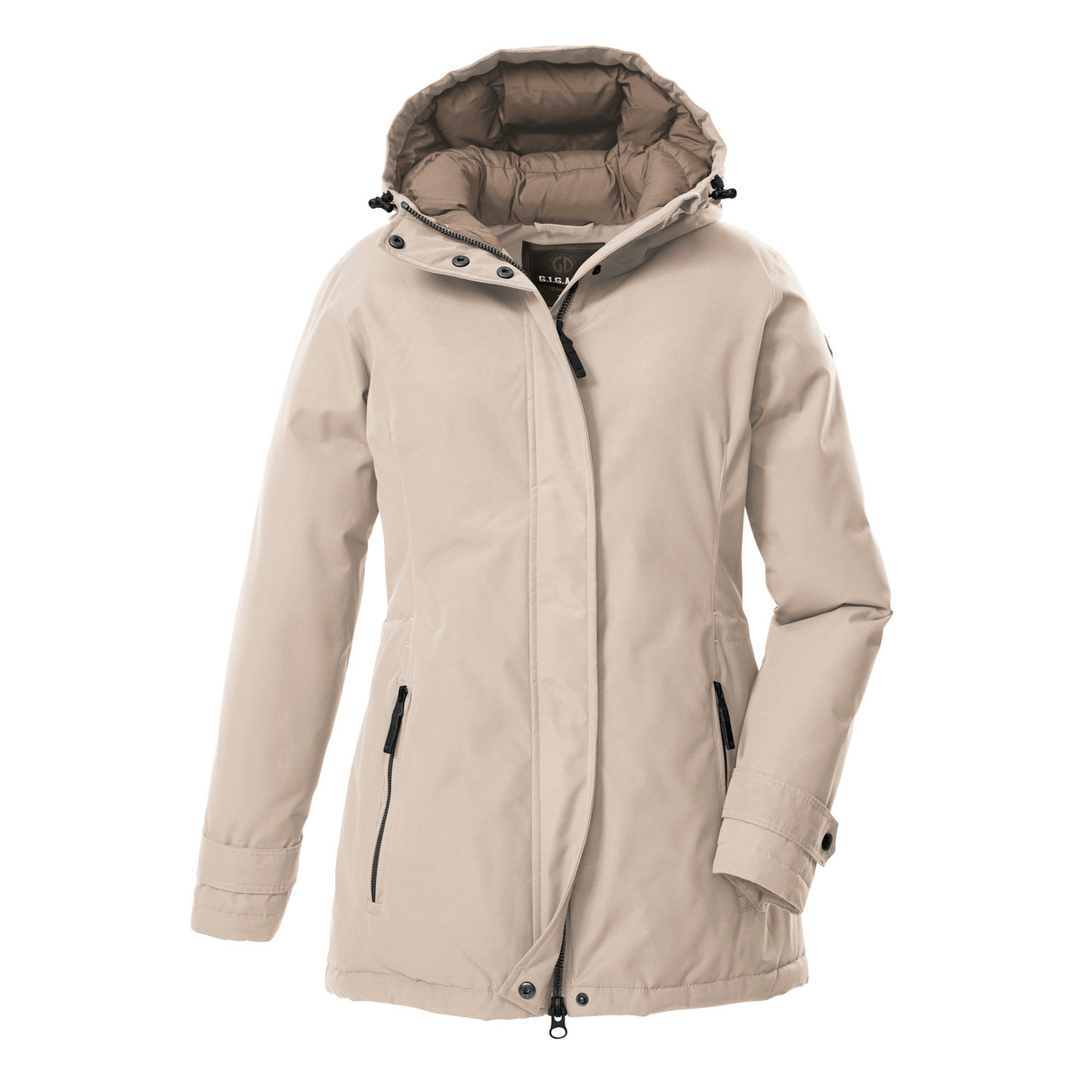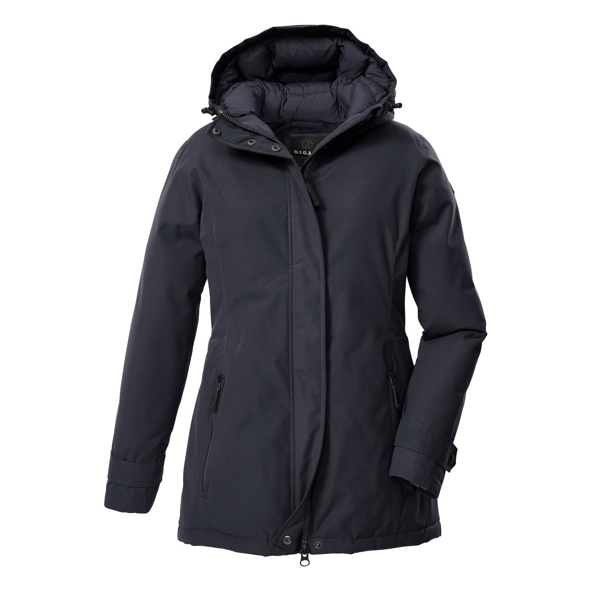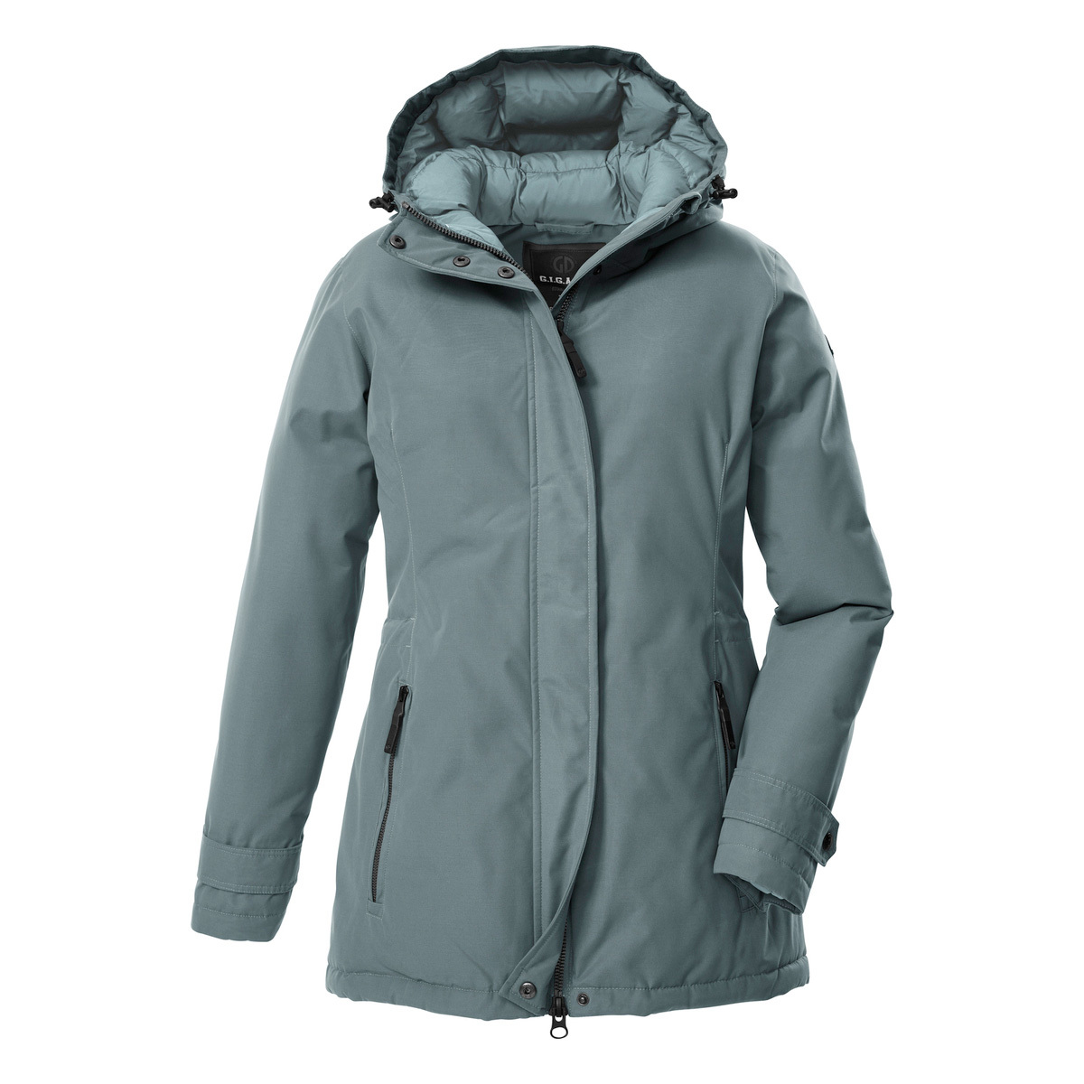 Mit der dick gefütterten Damen Funktionsjacke von G.I.G.A. DX kann der Winter kommen. Sie hat verschweißte Nähte und ist wasser- und winddicht mit einer 10.000 mm Wassersäule. Gleichzeitig ist sie atmungsaktiv mit einer Wasserdampfdurchlässigkeit von 3.000 g/m²/24 h. Die Kapuze und Ärmelbündchen sind verstellbar. Die Weite der Taille lässt sich anpassen. Der 2-Wege-Reißverschluss lässt sich von oben und unten öffnen und sorgt so für Bewegungsfreiheit. Zudem hat er einen praktischen Kinnschutz. Die beiden Seitentaschen sind verschließbar, sodass nichts verloren geht. Diese Jacke wurde PFAs-frei imprägniert und teilweise aus recyceltem Material hergestellt.