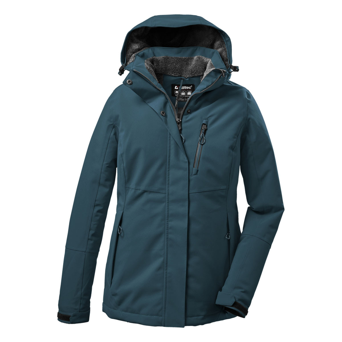 Die Damen Funktionsjacke von killtec in Kurzgröße (verkürzte Ärmel, verkürztes Rumpfteil) besticht durch zeitloses Design und zuverlässige Funktionalität. Sie ist mit einer 10.000 mm Wassersäule und durch verschweißte Nähte wasser- und winddicht (Tipp: Ab und zu sollte die Jacke neu imprägniert werden). Gleichzeitig ist sie atmungsaktiv mit einer 3.000 g/m²/24 h Wasserdampfdurchlässigkeit. Die Kapuze ist individuell regulierbar und kann bei Bedarf abgenommen werden. Die Ärmelbündchen sind durch Klettverschlüsse verstellbar. Kapuze und Kragen sind weich gefüttert mit kuschligem Teddy Fleece und schützen zusätzlich vor Wind und Nässe. Zahlreiche Taschen bieten genügend Stauraum für Handy, Schlüssel und Co. Der verdeckte Reißverschluss ist mit einem praktischen Kinnschutz ausgestattet. Diese Jacke wurde mit fluorfreien Mitteln imprägniert.
