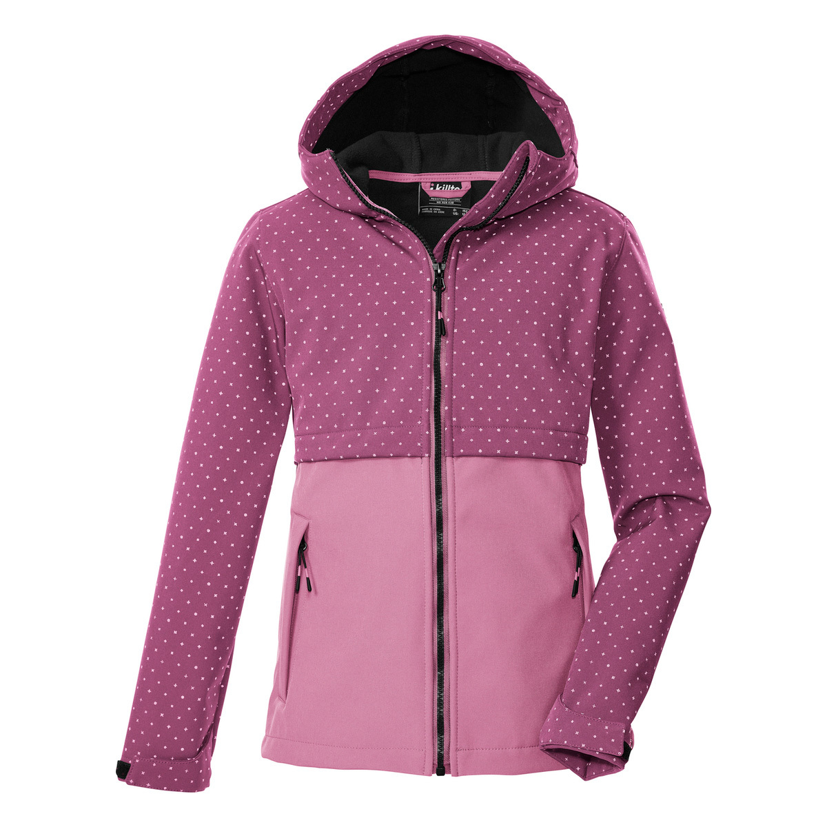 Die killtec Softshelljacke für Kids besticht durch ihr Colourblock-Design, den besonderen All-Over-Print und eignet sich besonders für die Übergangszeit. Die Jacke ist wind- und wasserabweisend mit einer 10.000 mm Wassersäule und hat einen atmungsaktiven Mesh-Einsatz. Der Rückenbereich und die Kapuze sind mit weichem Fleece gefüttert. Die Ärmelbündchen sind durch Klettverschlüsse regulierbar. Die zwei Seitentaschen sind mit Zippern verschließbar, sodass nichts verloren geht. Der Frontreißverschluss hat einen praktischen Kinnschutz, der die Haut vor dem Einklemmen schützt. Die Jacke ist zudem mit reflektierenden Elementen ausgestattet. Diese Jacke wurde PFAS-frei imprägniert (Unser Tipp: ab und zu sollte die Jacke neu imprägniert werden).