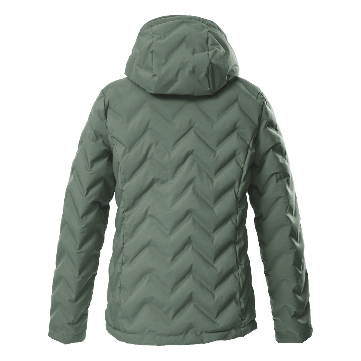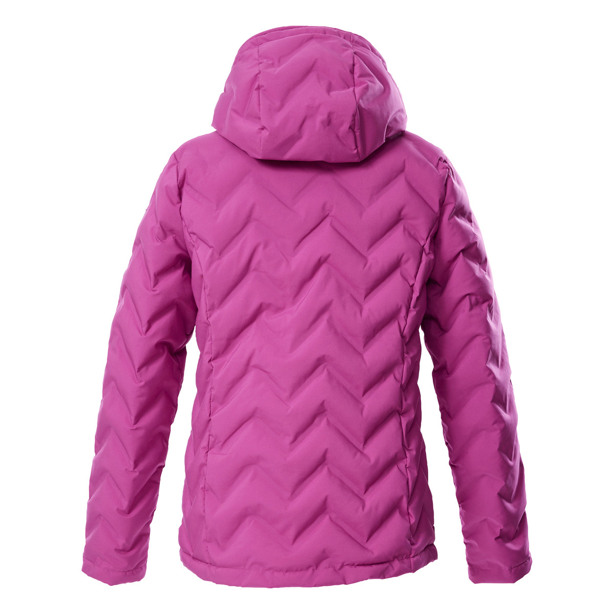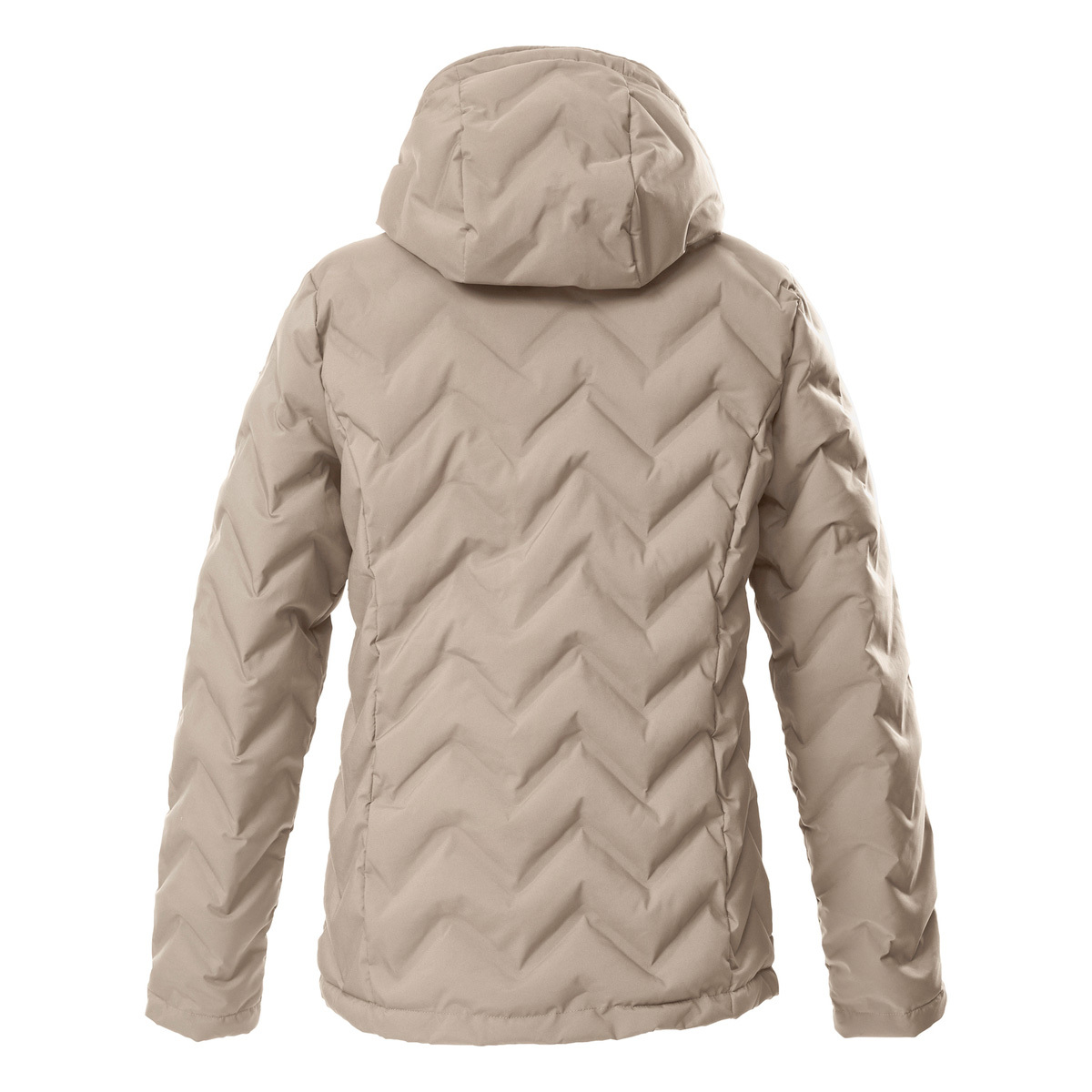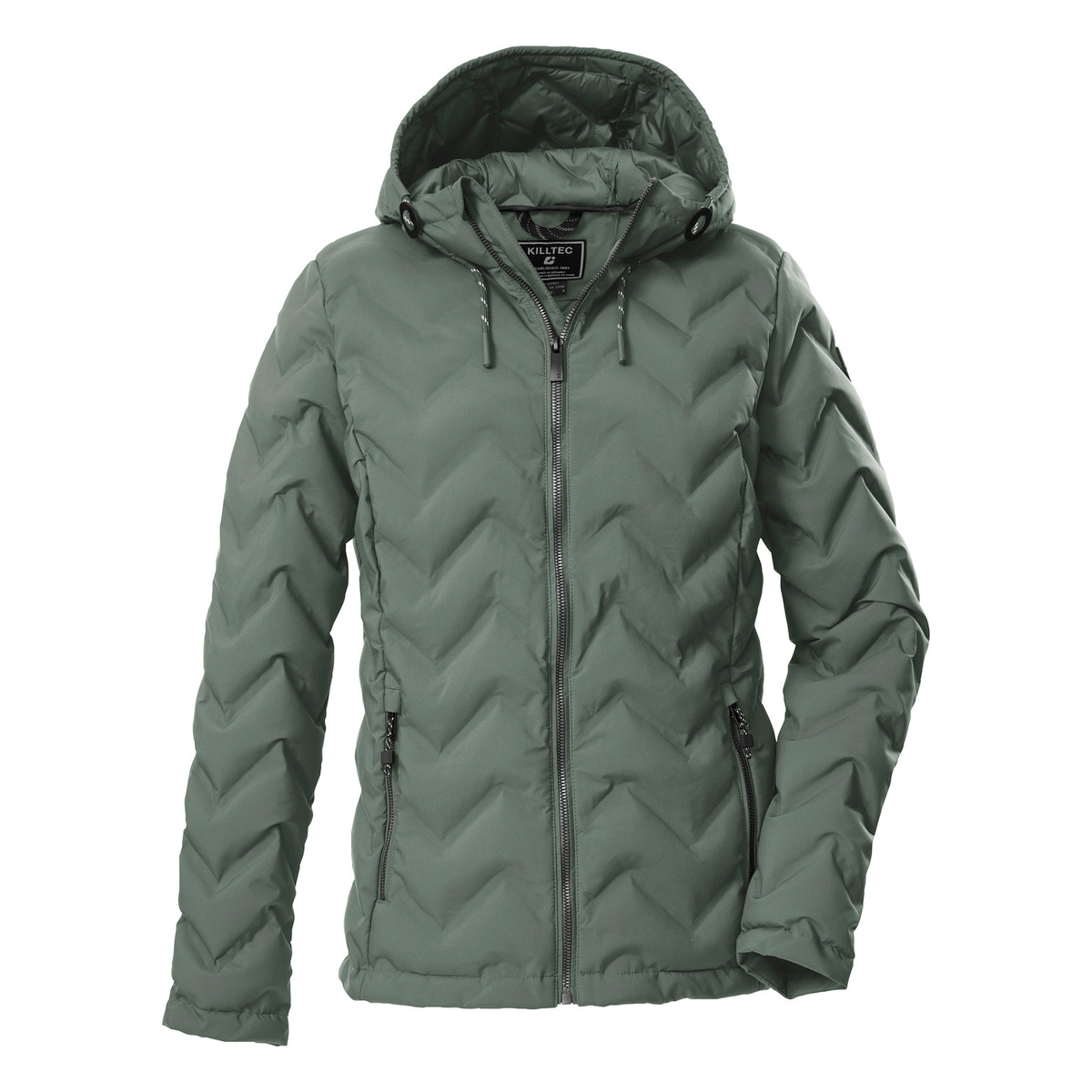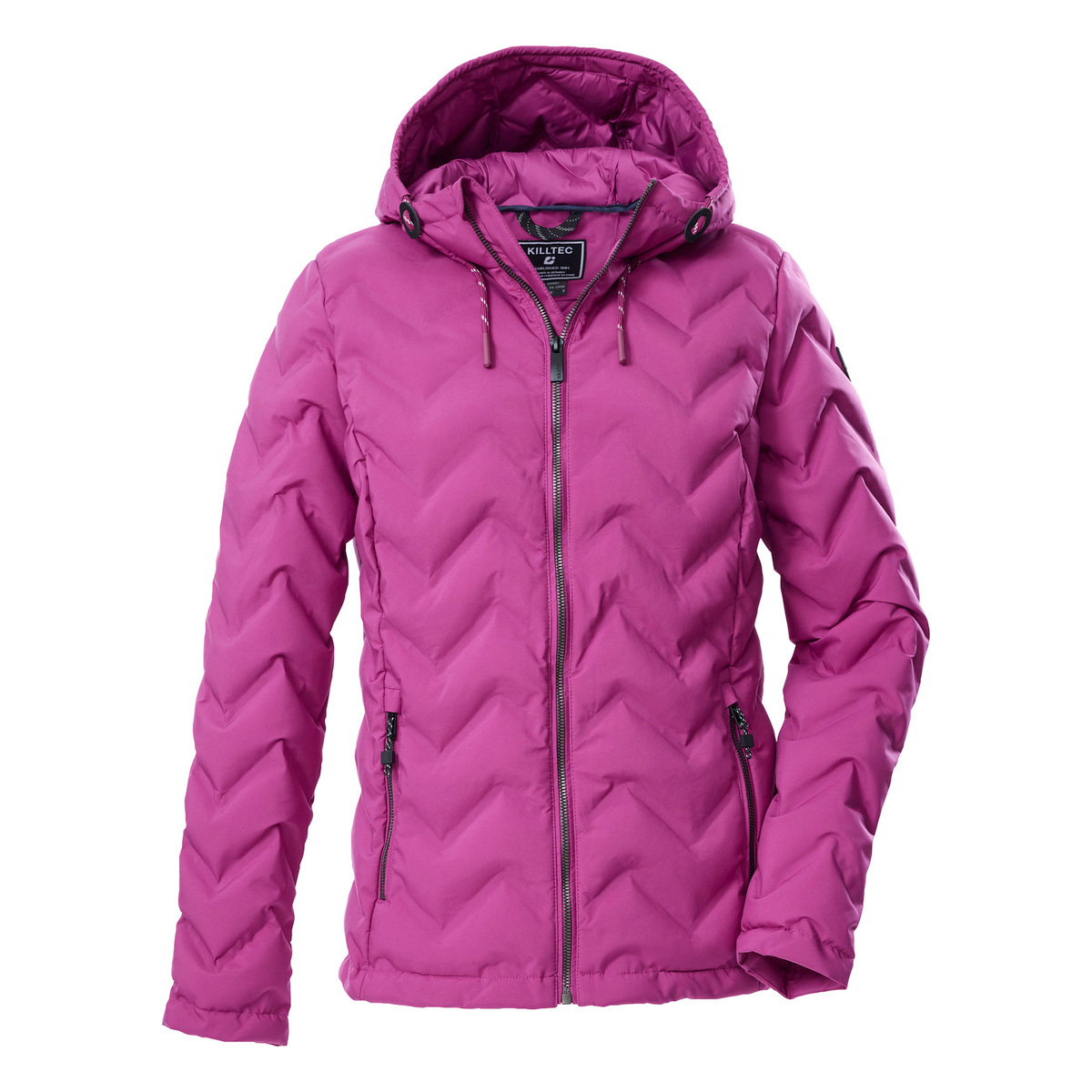 Die Damen Funktionsjacke in Daunenoptik von killtec ist der perfekte Allrounder für die kältere Jahreszeit. Sie ist wasser- und windabweisend mit einer 10.000 mm Wassersäule. Dekorativ verschweißte Kammern machen die Jacke zu einem echten Hingucker. Die Kapuze ist verstellbar. Die beiden Seitentaschen sind mit Zippern verschließbar, sodass nichts verloren geht. Innen ist die Jacke mit einer Handytasche ausgestattet. Der Frontreißverschluss ist mit einem praktischen Kinnschutz versehen, der ein Einklemmen der Haut verhindert. Diese Jacke wurde mit fluorfreien Mitteln imprägniert und teilweise aus recyceltem Material hergestellt.