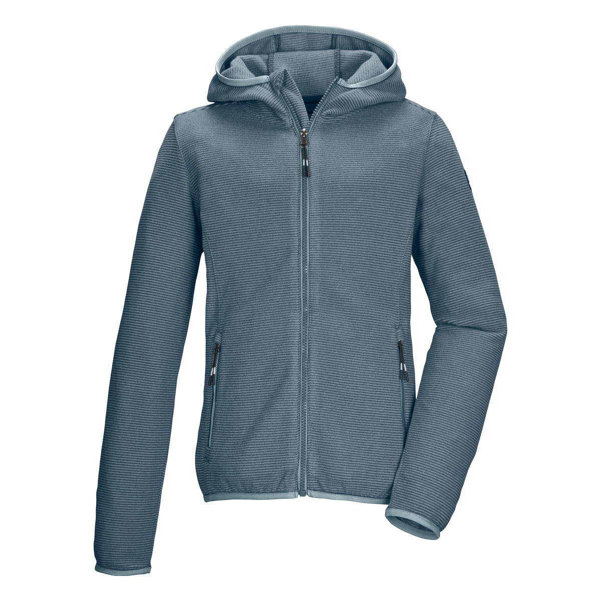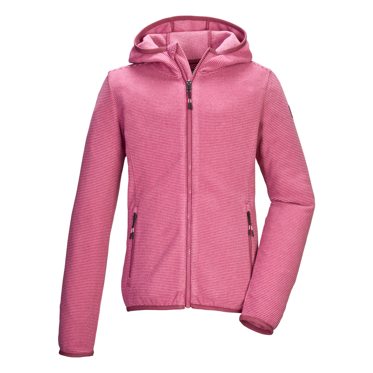 Die gestreifte Mädchen Fleecejacke von killtec ist der perfekte Begleiter in der kalten Jahreszeit. Sie eignet sich als Midlayer unter der wetterfesten Jacke oder als dünne Übergangsjacke. Sie hat eine Kapuze sowie verschließbare Seitentaschen. Saum und Ärmelbündchen sind elastisch. Der Reißverschluss ist mit einem praktischen Kinnschutz versehen.