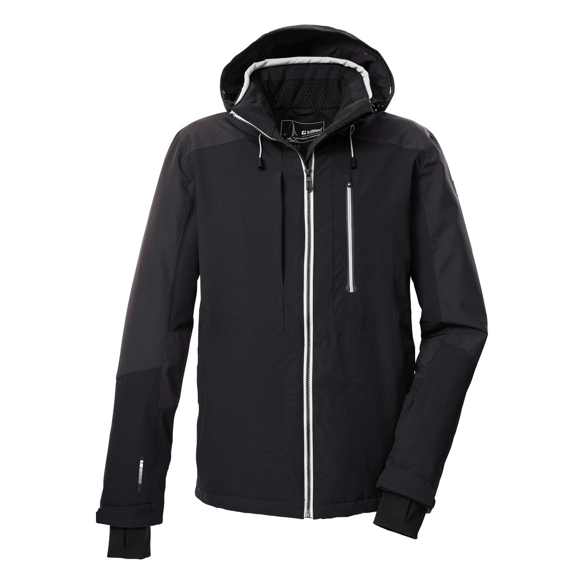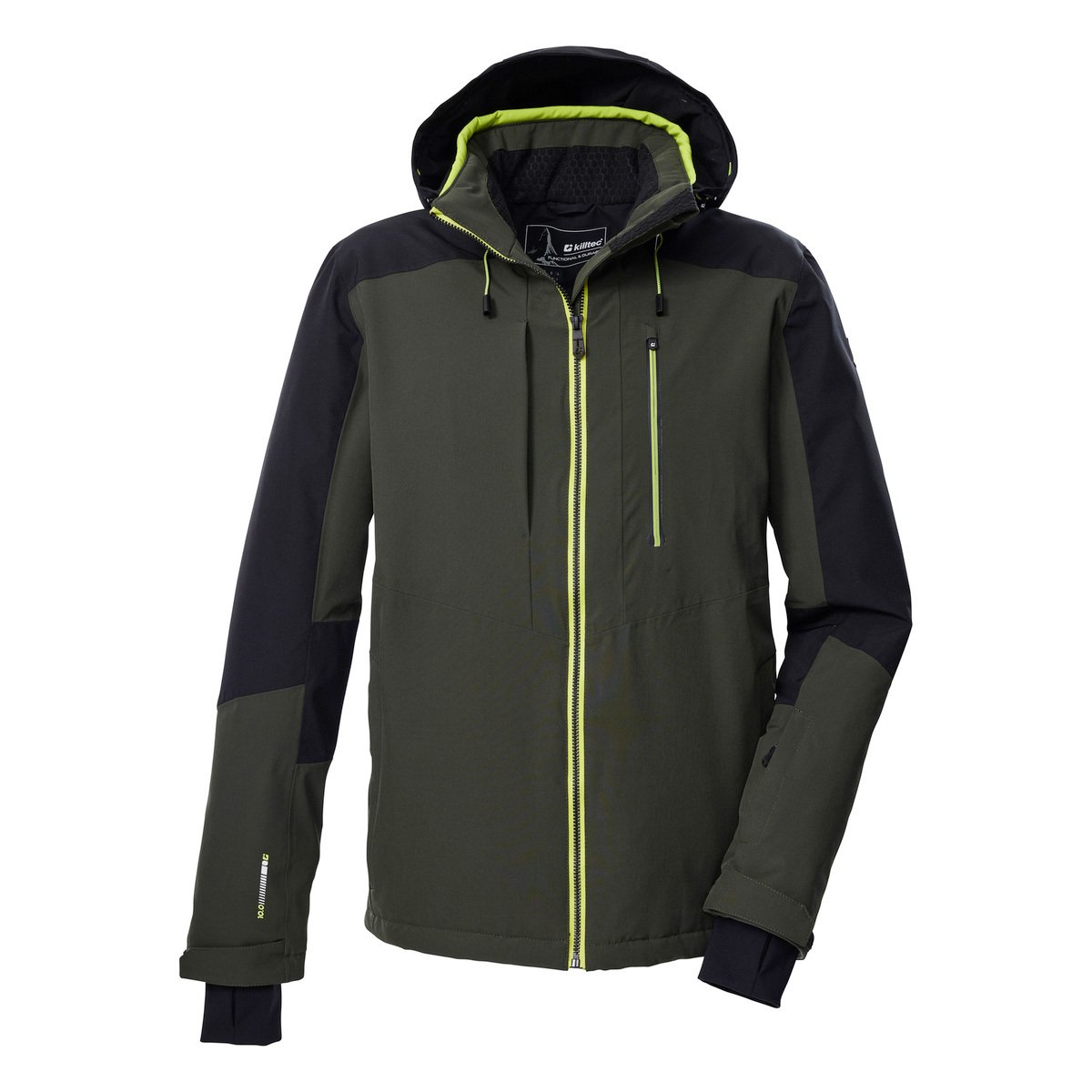 Die Herren Skijacke von killtec verbindet angesagtes Design mit pistentauglichen Features. Sie ist durch verschweißte Nähte, wasserdichte Zipper und mit einer Wassersäule von 10.000 mm wind- und wasserdicht (Unser Tipp: ab und zu sollte die Jacke neu imprägniert werden). Gleichzeitig ist sie atmungsaktiv mit einer Wasserdampfdurchlässigkeit von 3.000 g/m²/24 h. Innen ist die Jacke mit einem rutschfesten Schneefang, einer Skibrillentasche sowie einer Handytasche ausgestattet. Vier Zippertaschen und eine Skipasstasche bieten weiteren Stauraum. Die Weite der abzippbaren Kapuze und des Saumes lässt sich regulieren. Lycracuffs mit Daumenlöchern an den verstellbaren Ärmelabschlüssen verhindern das Eindringen von Kälte und Wind. Diese Jacke wurde PFAS-frei imprägniert und teilweise aus recyceltem Material hergestellt.