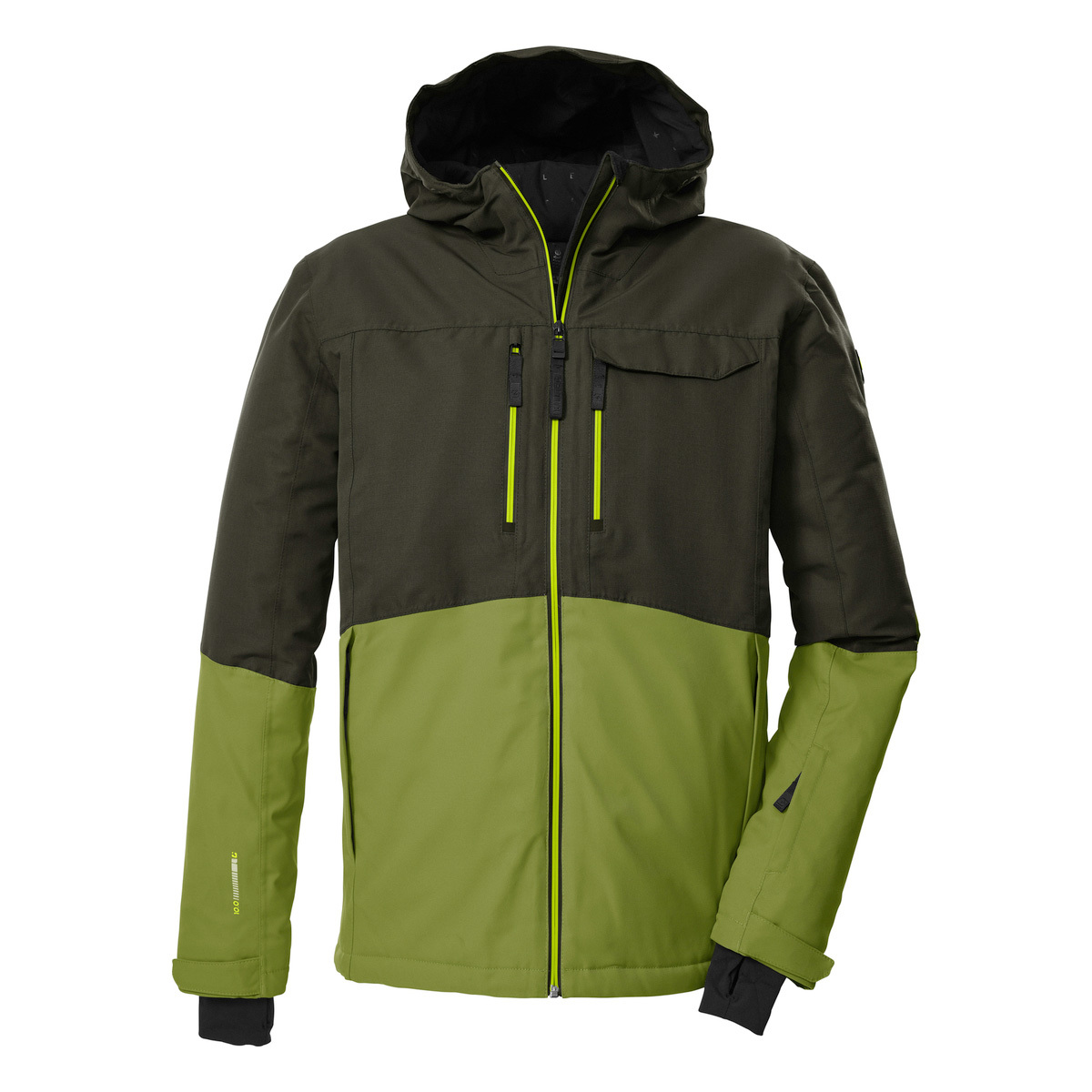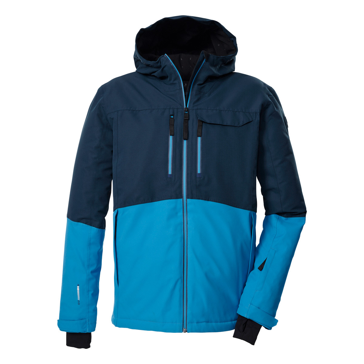 Die Herren Skijacke von killtec verbindet angesagtes Colourblock Design mit pistentauglichen Features. Sie ist durch verschweißte Nähte, wasserdichte Reißverschlüsse und mit einer Wassersäule von 10.000 mm wind- und wasserdicht (Unser Tipp: ab und zu sollte die Jacke neu imprägniert werden). Gleichzeitig ist sie atmungsaktiv mit einer Wasserdampfdurchlässigkeit von 5.000 g/m²/24 h. Innen ist die Jacke mit einem rutschfesten Schneefang, einer Skibrillentasche sowie einer Handytasche ausgestattet. Vier Zippertaschen außen und eine Skipasstasche bieten weiteren Stauraum. Die Weite der Kapuze und des Saumes lässt sich individuell regulieren. Lycracuffs mit Daumenlöchern an den verstellbaren Ärmelabschlüssen verhindern das Eindringen von Kälte und Wind. Diese Jacke wurde PFAs-frei imprägniert.